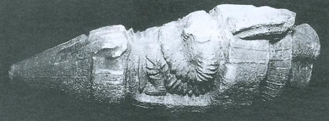 Das »Ding« sieht aus wie eine Rakete. Vorn läuft es spitz zu, nach hinten wird es breiter. Am Ende sind »Raketendüsen« zu erkennen. Was vom Piloten übrig geblieben ist, passt in den Kontext von bemannter Raumfahrt. In der »Rakete« hockt eine Gestalt. Sie trägt so etwas wie einen Raumanzug. Die Beine sind angewinkelt. Die Hände scheinen so etwas wie eine Steuerapparatur zu bedienen. Der Kopf der Gestalt ist leider abgebrochen. Trug sie so etwas wie einen Raumfahrerhelm? Das könnte sein! Im Brustbereich ist so etwas wie ein »Schlauch« zu erkennen, der womöglich an den »Helm« angeschlossen war.