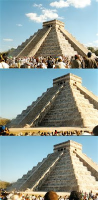 Ich habe diesen »Film« mit einigen Tausend anderen Besuchern am 21. März gesehen. Schon am Morgen hatte ich mich eingefunden. Erst gut anderthalb Stunden vor dem Sonnenuntergang begann’s: die Sonne leuchtete die dem Westen zugeneigte Pyramidenfläche an. Wie unzählige Kegel von Taschenlampen projizieren die Sonnenstrahlen Licht auf die nördliche Pyramidenfront. Dreiecke aus Licht entstehen, wandern von der Spitze der Pyramide nach unten. Ein Schlangenkopf taucht aus dem Schatten auf...