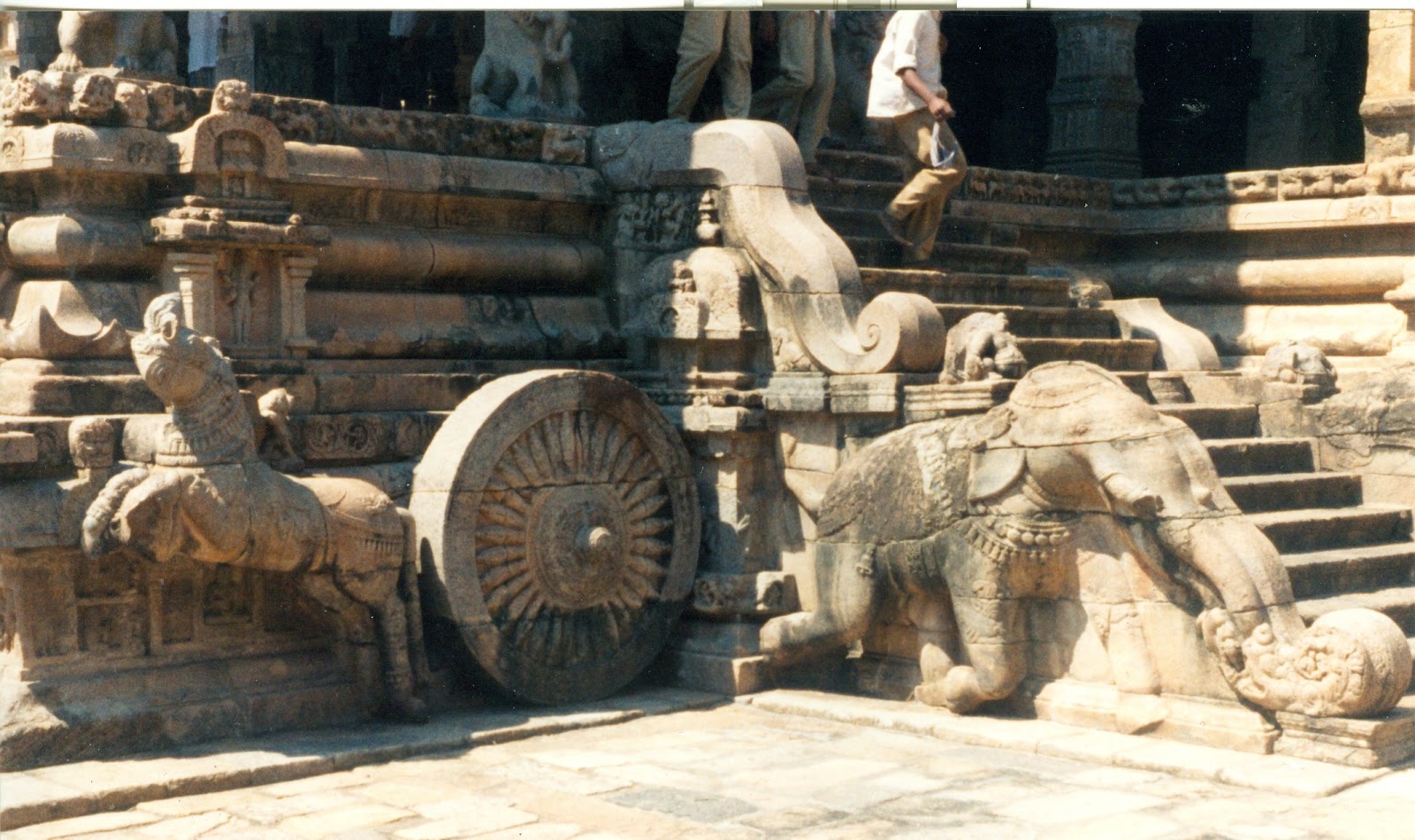 Ich staunte nicht schlecht, als ich den »Airavatesvara«- Tempel im Städtchen Darasuram, bei Kumbakonam gelegen, besichtigte. Das sakrale Hindu-Bauwerk wurde von Rajaraja Chola II im 12. Jahrhundert in Auftrag gegeben und finanziert. Es ist etwa 200 Jahre jünger als der »Gangaikondacholapuram«-Tempel. Bei meinem Besuch fiel mir sofort ein »Götterwagen« auf, der an die Vehikel erinnern soll, die offenbar vor Jahrtausenden zum Alltag des »Alten Indien« gehörten. Er wird, in Stein gehauen, von göttlichen Tieren gezogen.